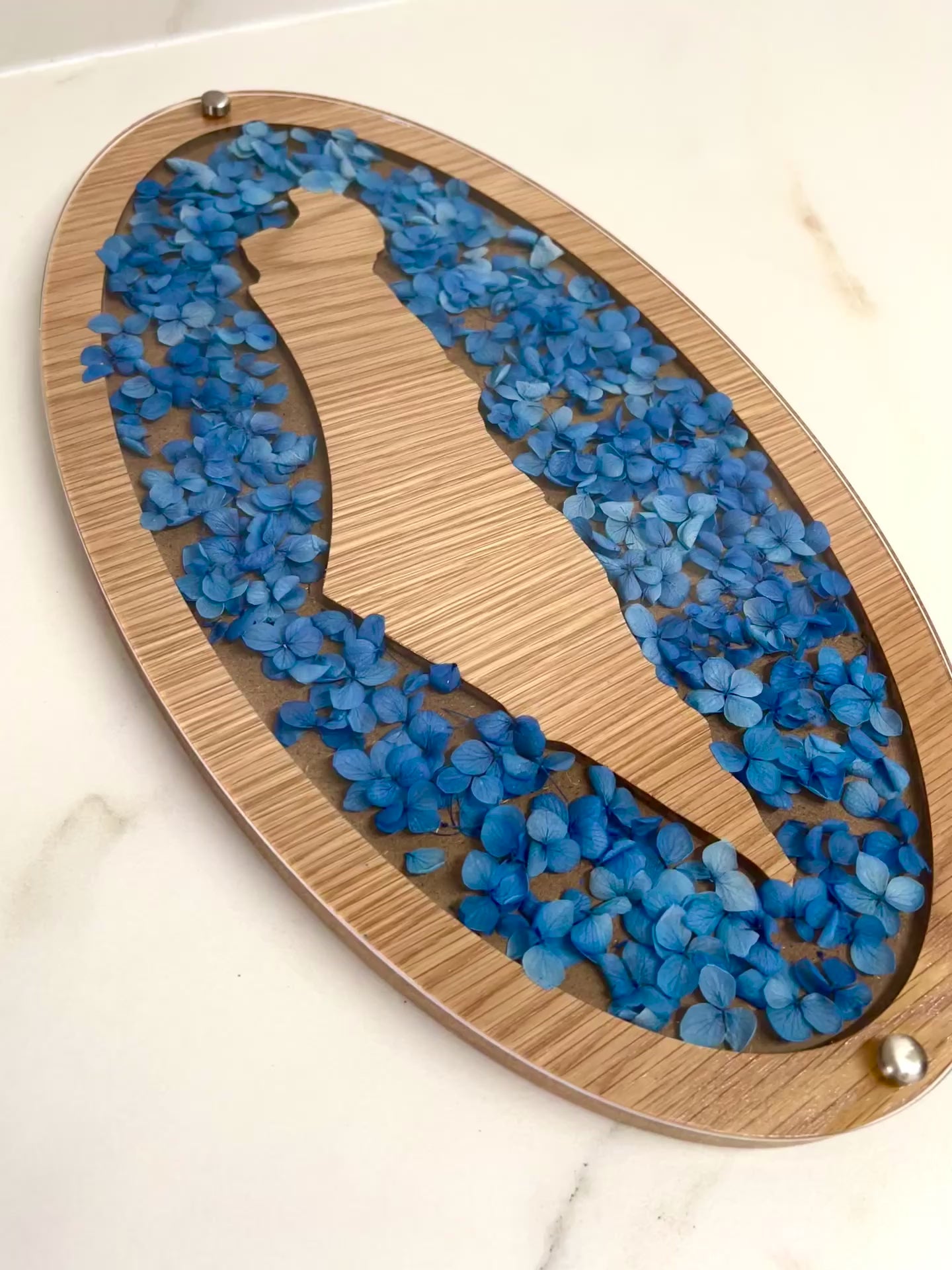 Handcrafted Challa platter made from wood and preserved hydrangeas Eretz Israel shaped.